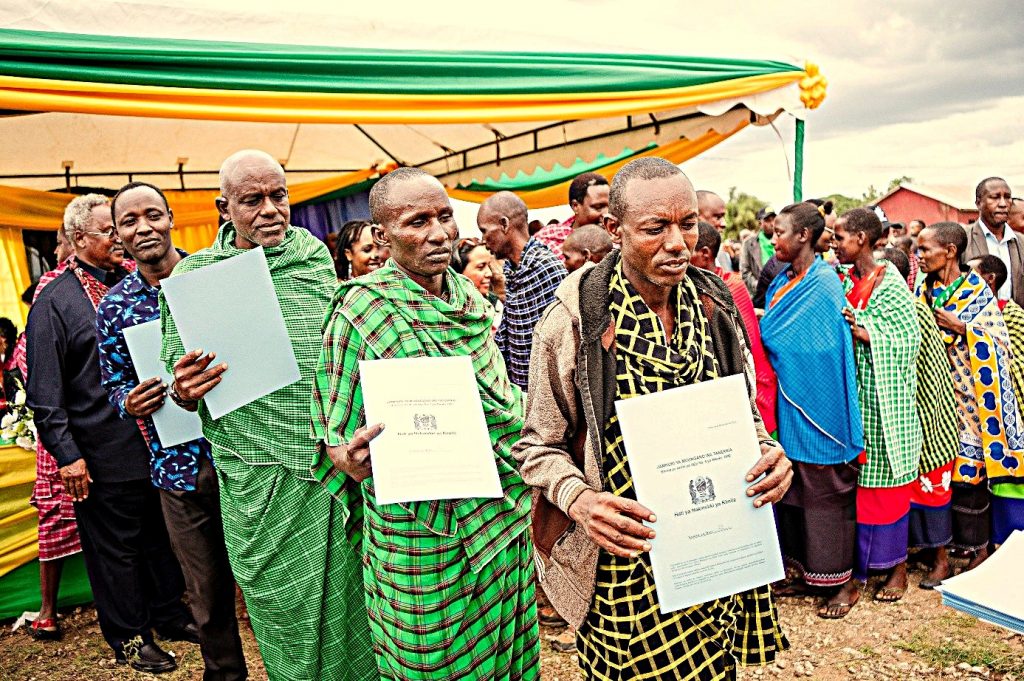 (Foto: Dismas Partlala und Julius Mando, mit Distriktvertretern anlässlich Übergabe des ersten CCRO für die Sandawe Community)